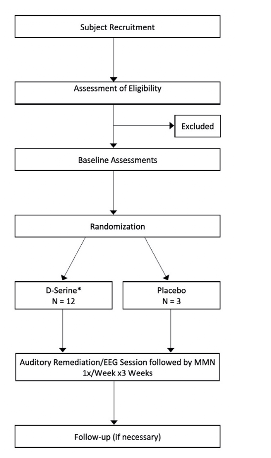 Subjects are randomized to either receive D-serine or placebo. Subjects will receive the same drug assignment/dose for each of the three treatment days. Randomization is stratified by baseline TMT [26], to allow for potential sub-group analysis. After a negative urine pregnancy test for fecund women and the Columbia Suicide Severity Rating Scale (C-SSRS) [171], each of the three treatment visits begins with a pre-treatment EEG capping. Baseline EEG is collected prior to treatment day 1 only. Subjects then receive D-serine or placebo and AudRem begins 30 min after study drug administration to allow for training during peak D-serine levels. EEG is recorded during sessions to assess ERO, including θ. Immediately after AudRem, subjects complete post-treatment MMN. A D-serine level is drawn after the session using established methods to allow for functional pharmacodynamics readout [138], along with urinalysis and clinical laboratory assessments. The SAFTEE assessment is used to assess general side effects [172].