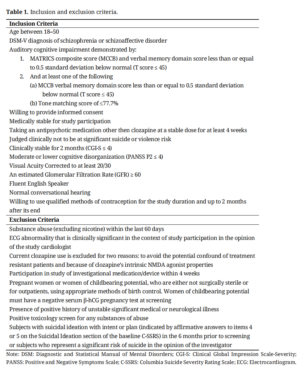 After informed consent, the subjects undergo full medical and psychiatric screening, which occurs over an up to 31-day period. After satisfying initial inclusion/exclusion criteria (Table 1), subjects complete baseline cognitive and behavioral assessments with a clinical rater.