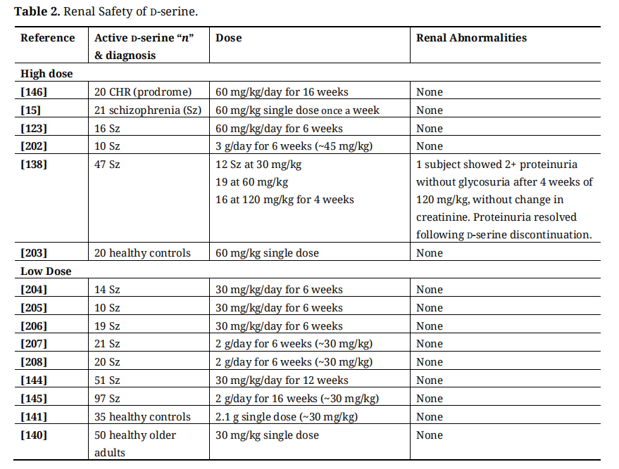 15 human trials have been published with D-serine (Table 2), including 451 subjects and treatment duration up to 16 weeks of daily dosing. 122 subjects received high dose (>30 mg/kg), including 16 patients at 120 mg/kg. Across all published studies, only one subject was reported to have abnormal renal values related to D-serine treatment [138]. The abnormality occurred in a subject receiving 4 weeks of the 120 mg/kg dose. Even at that dose, the abnormality was mild in that it involved only an increase in protein (2+ by dipstick) without an accompanying increase in glycosuria, change in creatinine level or other clinical symptoms. The abnormal urinalysis values fully resolved within a few days of stopping treatment. Overall, this 1 case represents 0.2% of all D-serine treated subjects, <1% of subjects treated with continuous high dose D-serine and one of sixteen (6.3%) of subjects treated continuously with 120 mg/kg, emphasizing safety. No renal adverse effects were noted in our prior, 1× weekly intermittent treatment study [15], nor in the ongoing R61. In the present study, overall D-serine exposure is 1/7 of that in prior studies, and thus has a built-in space between doses, maximizing safety.