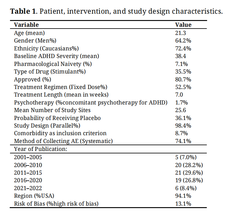 Covariates: We collected the following covariates: patient age (mean age within each RPCCT), gender distribution (proportion of male patients in each RPCCT), ethnic composition (proportion of Caucasian patients in each RPCCT), baseline ADHD severity (mean baseline score on the DSM-based ADHD-RS), treatment naivety (categorized as “yes” or “no”), type of drug (psychostimulant or non-stimulant), treatment regimen (fixed or flexible dose), treatment duration (in weeks), Intention to Treat analysis (categorized as “yes” or “no”), concomitant psychotherapy (administered or not), legal status of the drug (approved or non-approved), number of study sites, probability of receiving a placebo (expressed as a ratio of patients who received placebo to the total number of patients in each RPCCT, in percentage), study design (parallel or crossover), comorbidity as an inclusion criterion (categorized as “yes” or “no”), method for collecting AEs (open or systematic), publication year, geographical region (USA included or excluded), and an assessment of the risk of bias (see next section).