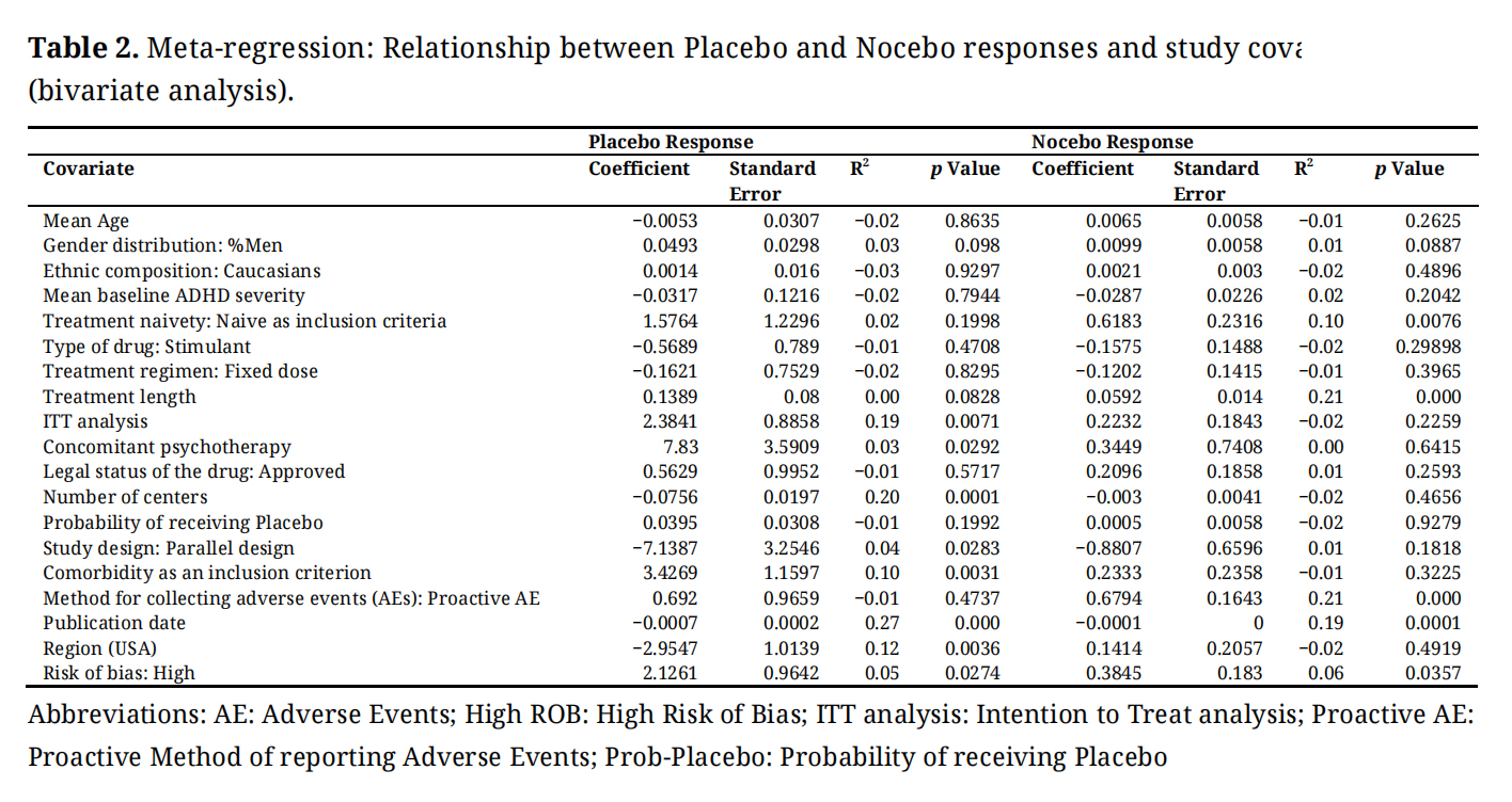 Barcheni M, Ramírez-Saco D, Cunill R, Farré M, Saez M, Castells X. A secondary meta-regression analysis of the relationship between placebo and nocebo responses in ADHD trials. J Psychiatry Brain Sci. 2025;10(5):e250012. https://doi.org/10.20900/jpbs.20250012.