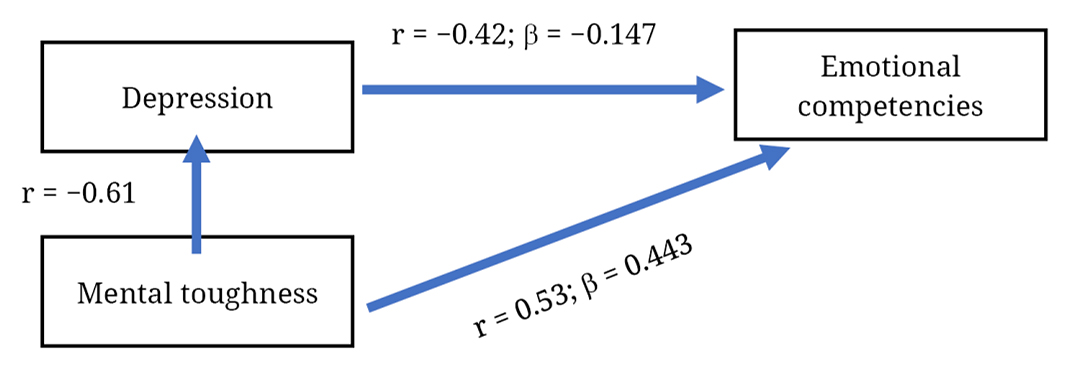 Background: Persons with multiple sclerosis (PwMS) reported lower emotional competencies (EC) and higher symptoms of depression (SD), compared to the general population. Mental Toughness (MT) reflects a person’s mental attitude to control their life, to stay committed to their aims, to perceive changes in life as a challenge, and to have confidence in their strengths. Research among the general population showed that MT had the potential to counterbalance SD. Here, we tested whether MT was related to SD and EC among a sample of PwMS.