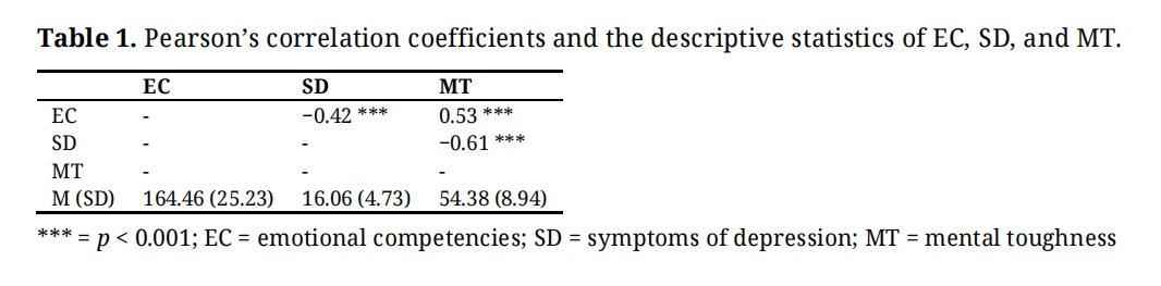 Table 1 reports the Pearson’s correlation coefficients and the descriptive statistics of EC, SD, and MT. Higher scores for EC were associated with lower scores for SD (r = −0.42 ***) and higher scores for MT (r = 0.53 ***). Higher SD scores were associated with lower scores for MT (r = −0.61 ***).