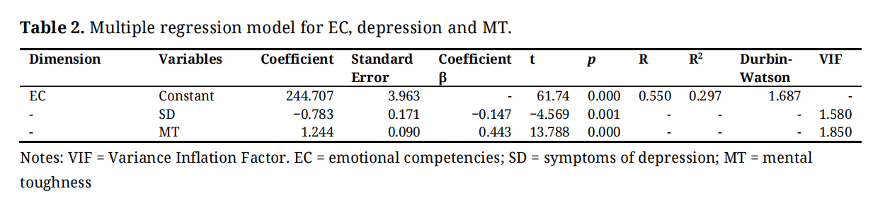 To investigate whether MT or DS, or both, were more strongly and independently associated with EC, a multiple regression analysis was run. Preliminary conditions to perform a multiple regression analysis were met as follows [31,32]: 1079 > 100; independent variables explained the dependent variable (R = 0.550; R2 = 0.297); number of independent variables: 2 (SD, MT): 2 × 10 = 20 < 1079; the Durbin-Watson coefficient was 1.687, indicating that the residuals of the independent variables were statistically independent. Last, VIFs were between 1.580 and 1.850; while there are no strict cut-off points to report the risk of multicollinearity, VIF < 1 and VIF > 10 indicate multicollinearity [31,32].
