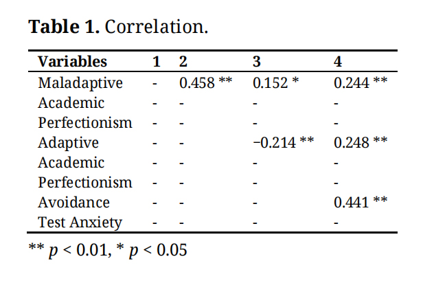 Table 1 shows the correlation strengths between maladaptive academic perfectionism, adaptive academic perfectionism, avoidance and test anxiety. As shown in the above correlation, maladaptive academic perfectionism is related to adaptive academic perfectionism (458), avoidance (152) and test anxiety (244). In contrast, having adaptive academic perfectionism avoid avoidance (r = −0.214, p < 0.01), but it is also associated with more test anxiety (r = 0.248, p < 0.01). Also, people reporting avoidance as a strategy are more likely to experience test anxiety (r = 0.441, p < 0.01). These results suggest that certain kinds of perfectionism are related to different mental responses and having maladaptive perfectionism tends to result in worse outcomes.