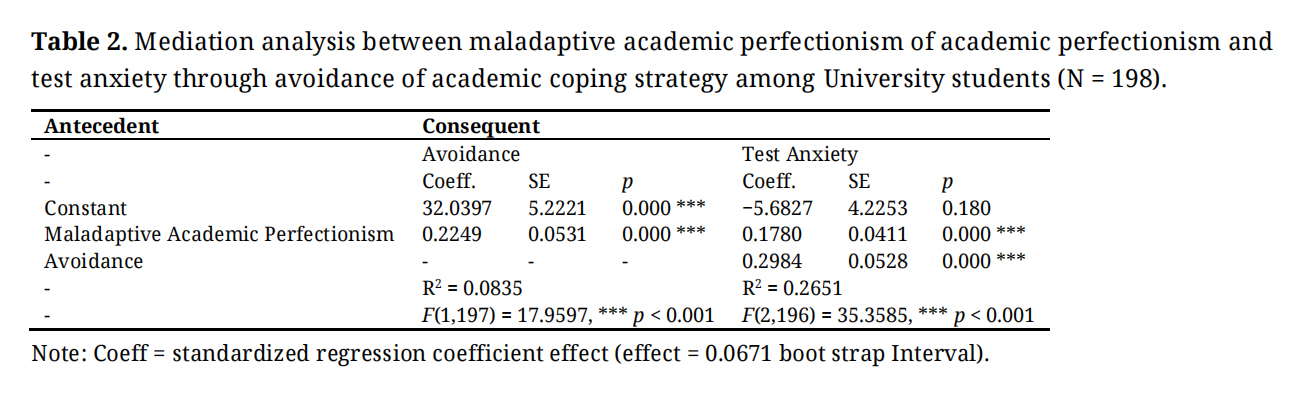 Table 2. Mediation analysis between maladaptive academic perfectionism of academic perfectionism and test anxiety through avoidance of academic coping strategy among University students (N = 198).