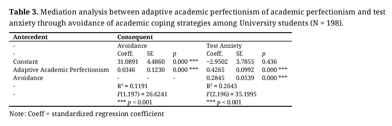 Table 3. Mediation analysis between adaptive academic perfectionism of academic perfectionism and test anxiety through avoidance of academic coping strategies among University students (N = 198).
