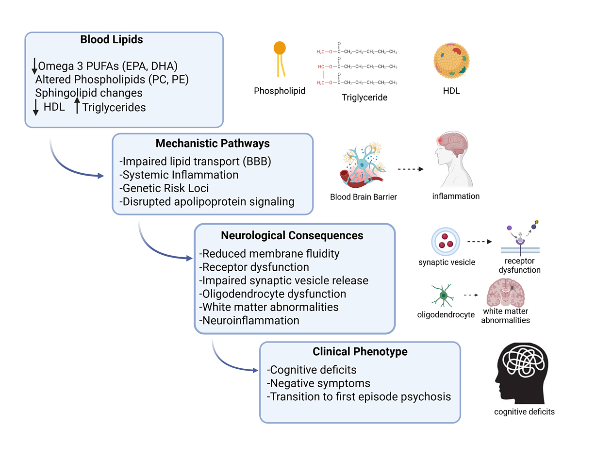 Figure 1. Peripheral lipid dysregulation as a precursor to psychosis. A schematic illustration shows how peripheral lipid abnormalities may contribute to the onset of psychosis. Blood lipids: Reduced omega-3 polyunsaturated fatty acids (PUFAs) (EPA, DHA), altered phospholipids (phosphatidylcholines, phosphatidylethanolamines), sphingolipid changes, and dyslipidemia (↓ HDL cholesterol, ↑ triglycerides). Mechanistic pathways include impaired lipid transport across the blood–brain barrier, systemic inflammation, genetic risk loci regulating lipid metabolism, and disrupted apolipoprotein signaling. Neurological consequences involve reduced membrane fluidity and receptor dysfunction, impaired synaptic vesicle release, oligodendrocyte dysfunction and white matter abnormalities, and increased neuroinflammatory signaling. The clinical phenotype includes these molecular and cellular disturbances manifesting as cognitive deficits, negative symptoms, and the transition from high-risk states to first-episode psychosis. HDL = High-Density Lipoprotein, EPA = Eicosapentaenoic Acid, DHA = Docosahexaenoic Acid. Arrows pointing downward (↓) indicate downregulation, while arrows pointing upward (↑) indicate upregulation. [Created in BioRender. Roychaudhuri, R. https://BioRender.com/xz3oi1m accessed on 10 Nov 2025].