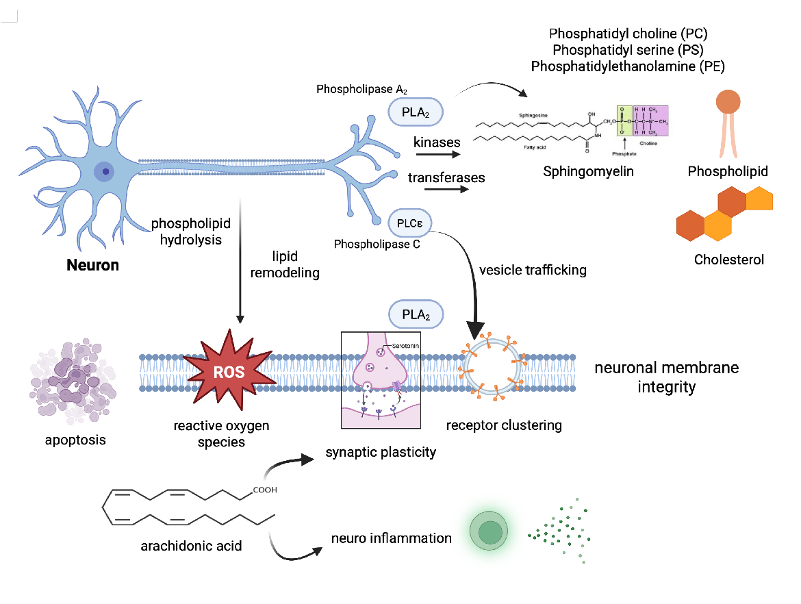 Figure 2. Phospholipid Metabolism and Membrane Integrity in Neurons. This schematic illustrates key phospholipid metabolic pathways and their roles in maintaining neuronal membrane integrity. Phosphatidylcholine (PC), phosphatidylethanolamine (PE), and phosphatidylserine (PS) are produced and remodeled via enzymatic reactions involving phospholipases (PLA, PLC, PLD), kinases, and transferases. Phospholipase-driven hydrolysis releases bioactive lipids like arachidonic acid, which can activate signaling pathways influencing neuroinflammation and synaptic function. Preserving PS asymmetry and membrane fluidity is essential for vesicle trafficking, receptor clustering, and synaptic plasticity. Disruption of these pathways may weaken membrane integrity, increase vulnerability to oxidative stress and apoptosis, and contribute to neuropsychiatric disorders. [Created in BioRender. Roychaudhuri, R. https://BioRender.com/a462kr1 accessed on 10 Nov 2025].