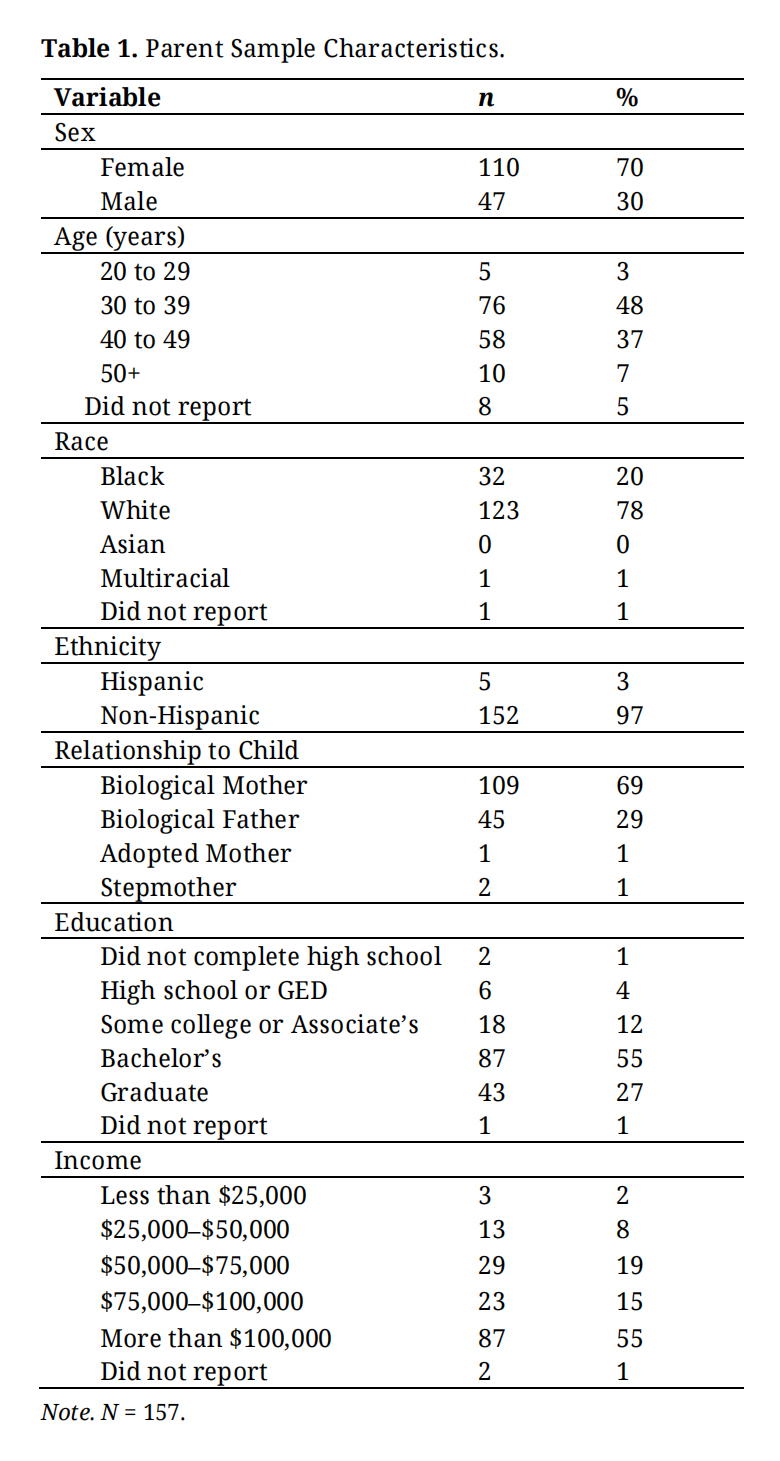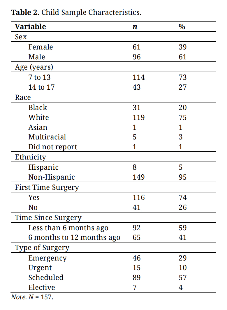 Participants were 157 parents and their children (dyads) located in the United States. Children were eligible to participate in the study if they were between the ages of 7 and 17, had a surgical procedure in the past 12 months, and were able to read and answer questions in English independently. A surgical procedure in this study was operationalized as a medical procedure that involves surgery, including both emergency and elective procedures. Only complete dyads in which both the parent and child provided data were included in this study. The sample of parents was 70% female, 78% White, 20% Black, 1% multiracial, and 3% Hispanic. Children were ages 7 to 17 (M = 11.65, SD = 2.74), with the majority (73%) between the ages of 7 and 13 years. The sample of children was 61% male, 75% White, 20 % Black, 1% Asian, 3% multiracial, and 5% Hispanic. Additional information on the parent characteristics is provided in Table 1, and further information on child characteristics is provided in Table 2.