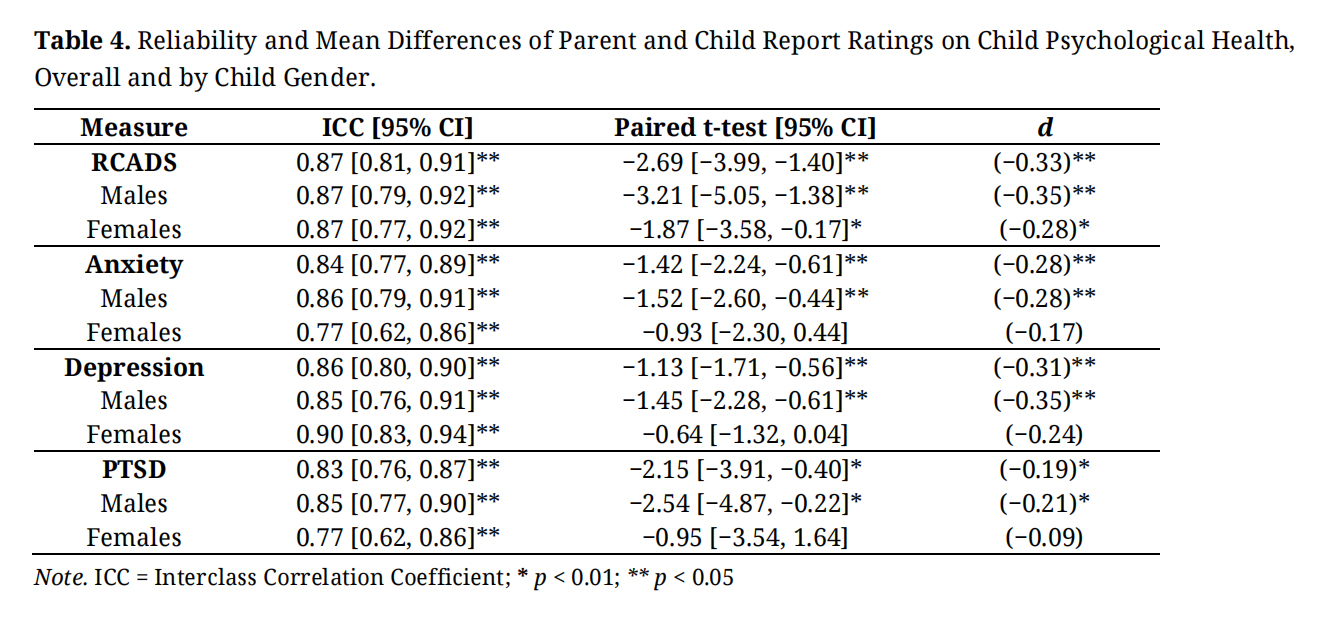 Table 4. Reliability and Mean Differences of Parent and Child Report Ratings on Child Psychological Health, Overall and by Child Gender.