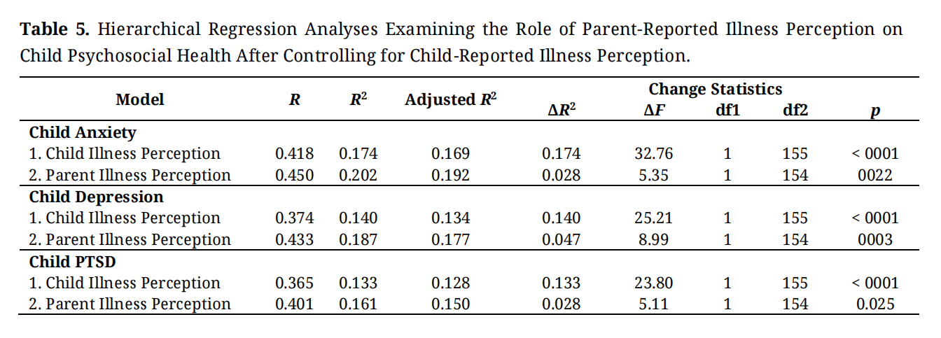 Table 5. Hierarchical Regression Analyses Examining the Role of Parent-Reported Illness Perception on Child Psychosocial Health After Controlling for Child-Reported Illness Perception.
