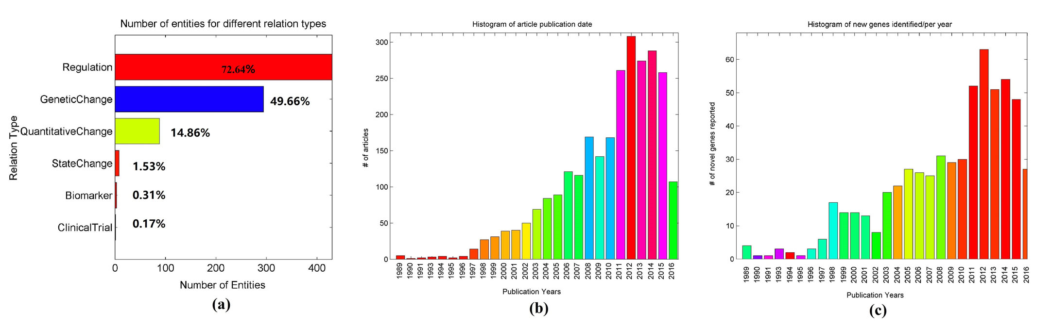 3.1.1 Anxiety-gene relation data summaryOf the 592 genes associated with anxiety, 430 (72.6 %) genes represented a relationship of regulation to the disease, 294 (49.7 %) genes represented a relationship of genetic change with the disease, 88 (14.9 %) genes represented a relationship of quantitative change with the disease, 8 (1.5 %) genes represented a relationship of state change with the disease, 3 (0.3 %) genes represented a relationship of biomarker with the disease, and 1 (0.2 %) genes was associated with a clinical trial (Figure 1a). Please note, 178 (30.1 %) of these genes have been reported to have multiple relationships with the disease. Specifically, 414 (69.9 %) genes were extracted with only one type of relationship to the disease, 132 (22.3 %) with 2, 3.7 (6.4 %) with 3, and 8 (1.35 %) with 4. For detailed definition and description of these relation types, please refer to the ‘Relation Types and Definitions’ section at Pathway Studio ResNet Database Description and Workflow Examples.