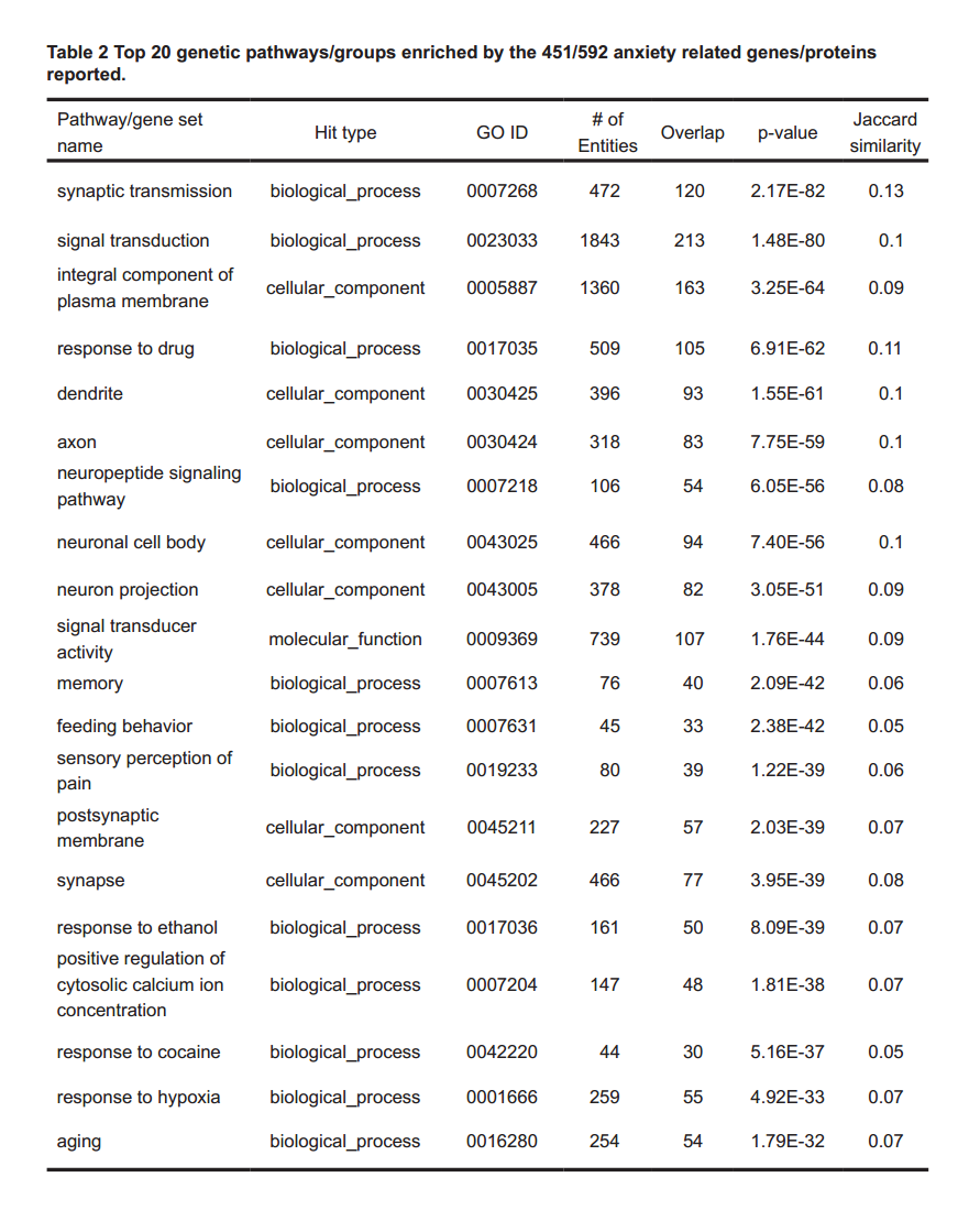 Pathway enrichment analysis results showed that most genes identified by this study were included in the pathways previously implicated in anxiety (Supplementary Table S2), including 13 pathways/gene sets that were related to the neuronal system (with 381 unique genes), 5 to brain function/development (94 unique genes), 5 to behavior (95 unique genes) and 1 to transcription factors (93 unique genes). In addition, we identified one ontology term related to aging (54 unique genes)[21-26]. Although there may be some level of false positives from the separate studies, we hypothesize that the majority of these literature reported genes, especially the ones that were identified from significantly enriched pathways, should be functionally linked to anxiety.