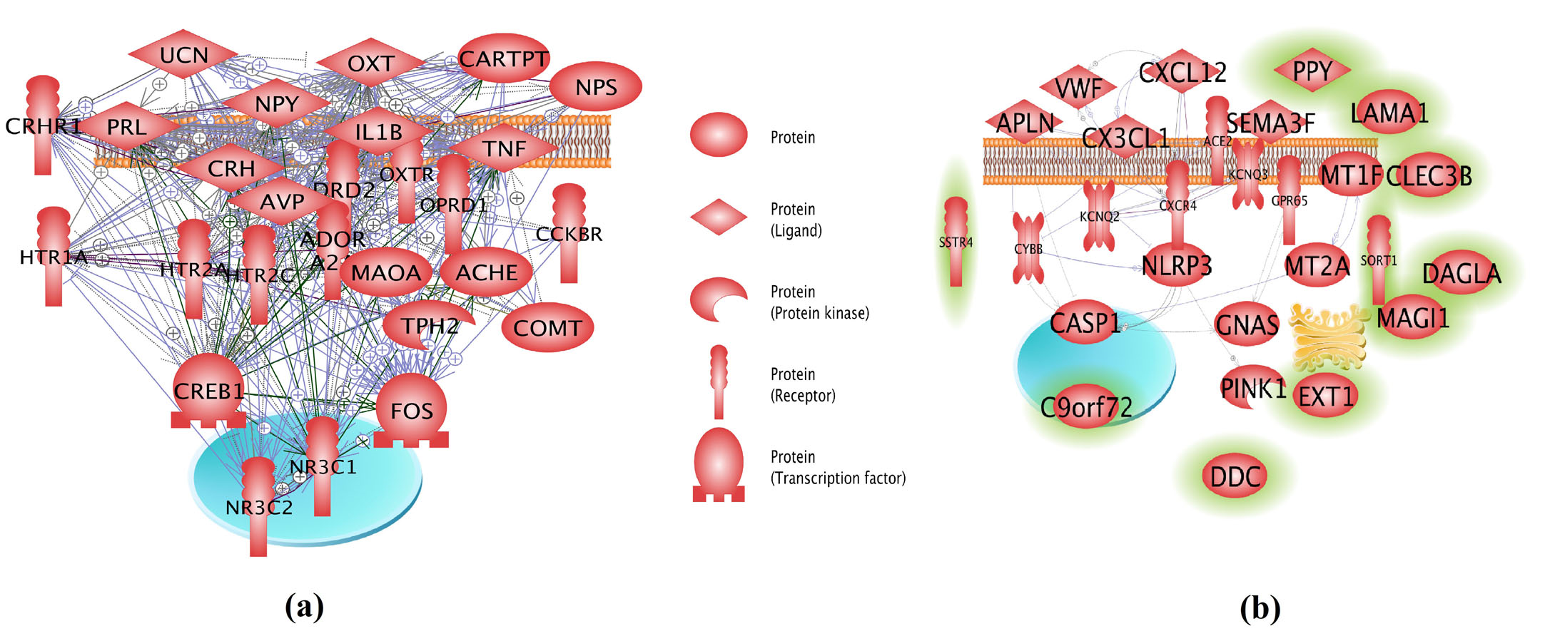 2.2 Identification of anxiety candidate pathwaysTo better understand the underlying functional profile and the pathogenic significance of the reported genes, a pathway enrichment analysis (PEA) was performed allowing the identification of candidate anxiety pathways. Additionally, a Sub-Network Enrichment Analysis (SNEA) was conducted[16]. SNEA, an extension of PEA, constructs gene sets “on the fly” using the global network of protein-disease regulation as represented in the Pathway Studio database. In this study, we performed SNEA using all anxiety candidate genes against a protein- disease related subnetwork, for the purpose of identifying diseases that share a genetic basis with anxiety. For detailed information regarding SNEA please refer to[16].