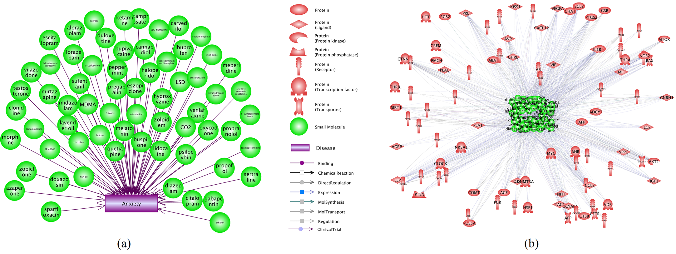 3.4 Validation from anxiety drug studiesAnalysis of anxiety-drug relation data showed that there were 618 drugs that have been proven effective in treating anxiety, supported by 3,832 preclinical or clinical studies (see Supplementary Table S6). Furthermore, 65 out of the 618 drugs have been through clinical trials (Figure 5a).