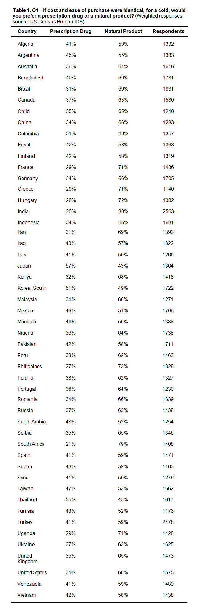 There are undoubtedly reasons why some individuals rely more on natural remedies than on pharmaceuticals. Pharmaceutical products are negatively viewed by many as symbols of unwanted modernity, capitalism, industrialization, urbanization, globalization, Westernization and/or technology. It may be a point of pride to express a preference for traditional medicines, a way of establishing one’s identity perhaps, and distinguishing oneself from the mainstream[7, 8]. If this were the case, differences in preference for natural remedies should distinguish some countries from others.