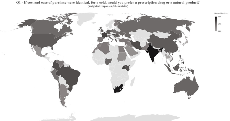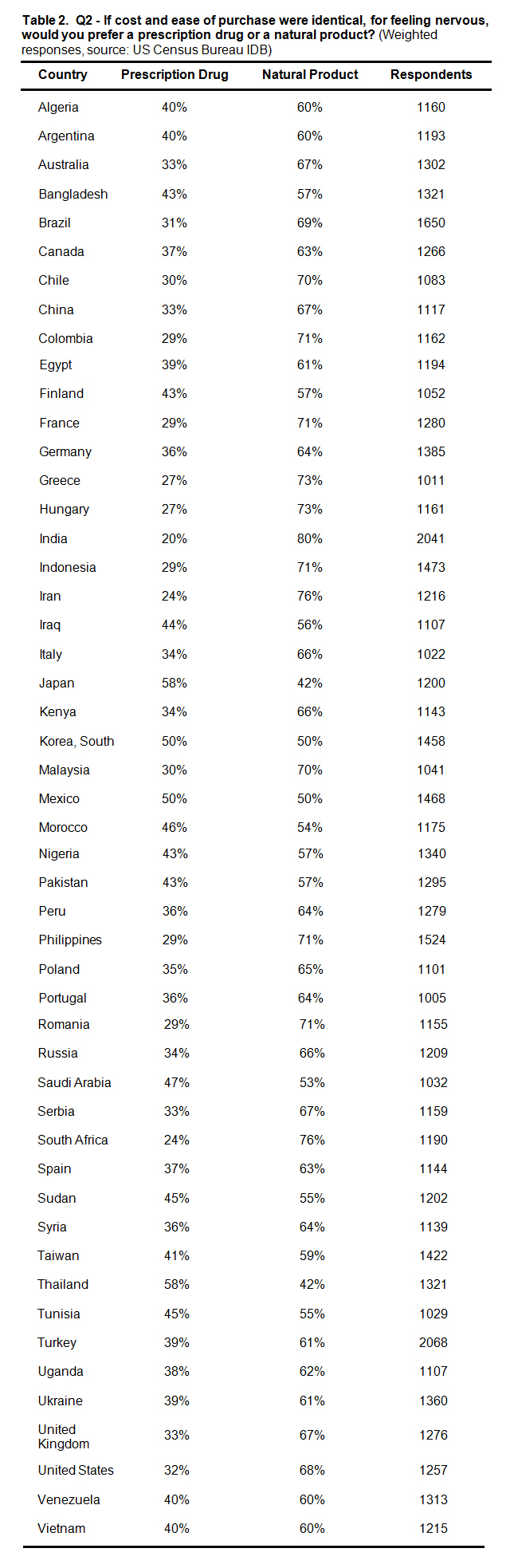 The survey has several limitations. Only individuals with Internet access (skewed toward young males, the relatively well-to-do, and the better educated) during July 2017 were reached. Currently, only approximately 40 % of the world has access to the Internet. Furthermore, in order to avoid burdening respondents with survey fatigue and increasing self-selection bias, only two health conditions were investigated. Comparisons of “nervousness” with conditions more serious than the common cold would have been interesting. It would also have been interesting to probe respondents’ reasons for their choice. Since many conventional drugs (e.g. digitalis, reserpine, scopolamine, quinine) have been derived from herbs, and since doctors sometimes prescribe herbal preparations, the distinction between natural and prescription drugs may have been confusing to respondents. This may have been especially the case in Japan where herbal products are prescribed by physicians.