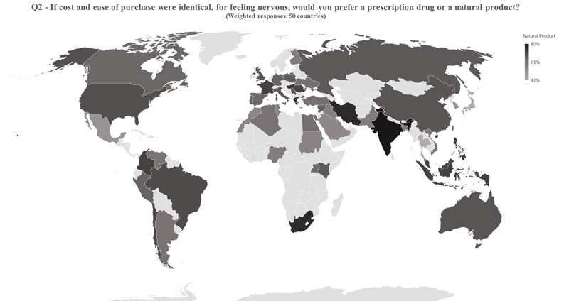 In order to assess the prevalence of use of natural remedies for “nervous” disorders, a global random online survey was conducted in July 2017 using RDITTM sampling methodology. There were 75,101 respondents worldwide. For both nervousness and common colds, the preference was for natural plant remedies over prescription drugs, with at least a 3:2 margin for most of the 50 countries surveyed. The preference for natural products was not restricted to any specific demographic although respondents over age 65 were less likely than younger respondents to endorse this preference. The two countries that were exceptions to this general observation were Japan and Thailand, and the reasons for this are probed in the discussion. Despite known safety hazards of natural remedies, their use has become a universal phenomenon.