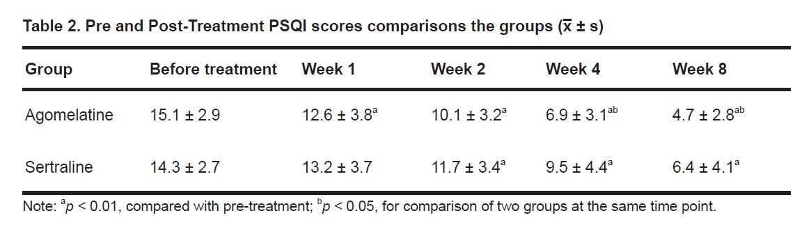 3.2 Pre and Post-Treatment PSQI Scores ComparisonThe average PSQI total scores for both groups decreased at each time point after for weeks 1, 2, 4, and 8. The range of decrease range increased with treatment duration. Agomelatine group PSQI scores significantly decreased after the first week. The sertraline group PSQI scores significantly decreased after the end of week two (p < 0.01). A comparison shows significant PSQI scores differences between the two groups at the end of week 4 and 8 (p < 0.05) (Table 2).