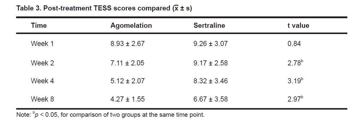 3.3 TESS score comparison during the treatmentAgomelatine group subjects were subject to gastrointestinal symptoms, such as nausea, diarrhea, and dyspepsia. Sertraline group subjects were subject to headache, dizziness, dry mouth, and loss of appetite. Agomelatine group TESS scores at the end of week 2, 4, and 8 were significantly lower than the sertraline group (p < 0.05) (Table 3).