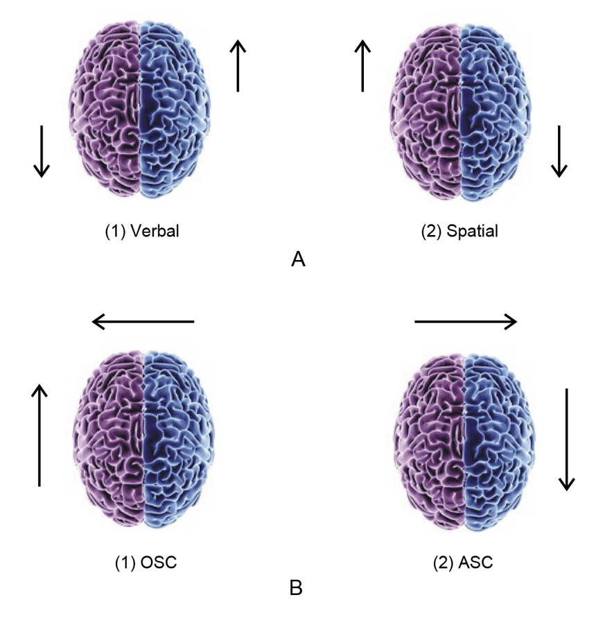 Fig. 1 Regional brain activation patterns. (A) Verbal vs. spatial tasks; (B) Ordinary vs. altered states of consciousness (OSC vs. ASC). OSC: left anterior dominance characterized by the causal operator “analytical mode” of awareness; ASC: right posterior dominance characterized by the intuitive operator “experiential mode” of awareness.