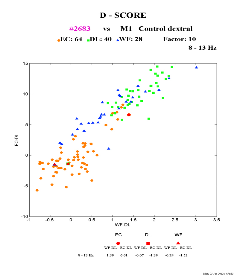 For the cannabis patient who completed the verbal and spatial activation tasks, the data is presented on Fig. 2. In the passive (EC) condition, the subject’s D-scores that provide statistical separation between the mean distributions fall outside the control range (red vs. orange circles) and clusters between the spatially activated vs. cognitively activated controls, suggesting abnormal overactivation bilaterally in the resting state. By contrast, under the conditions of either spatial or cognitive activation (DL or WF), the subject fell fully within the resting domain for the normal population. This finding may have implications for the capacity of cannabis-impaired subjects to engage relevant brain circuitry in goal-directed tasks, whether verbally or spatially based, although further studies would be required to corroborate this finding.
