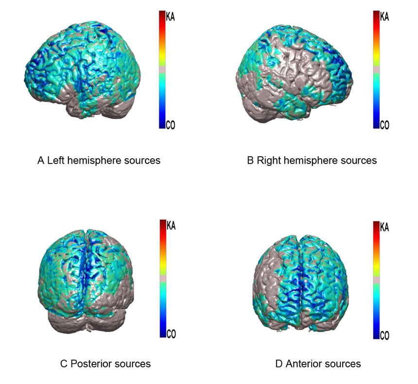 The source analysis showed increased sources in the eyes open condition at 14–20, 21–50 Hz and 40 Hz.