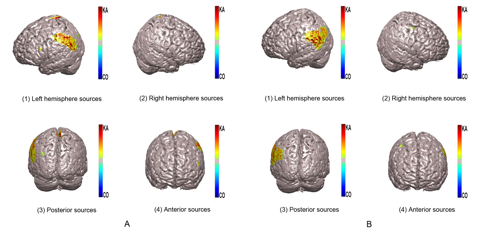 In the low beta frequency (14–20 Hz, EO condition), there is an area of increased sources in the left temporo-parietal region (Fig. 4A(1,2)). A similar pattern of increased sources in the left temporo-parietal region is evident in the high beta (21–50 Hz, EO condition, Fig. 4B(1,3)), and in the gamma band (38–42 Hz, EO condition, Fig. 5A,C).