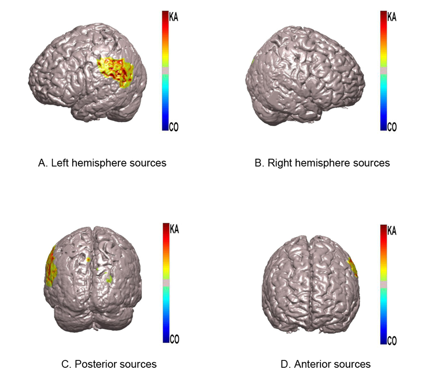 The BEAMFORMER source analysis by the power band distribution shows that in the alpha frequency (8–13 Hz, EC condition), the cannabis group had decreased power over the whole of the left hemisphere and posteror-frontal and temporo-parietal aspects of the right hemisphere, suggesting generalized overactivation in these regions (Fig. 3A–D).