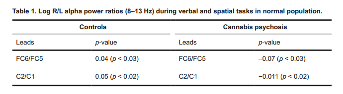 These findings suggest a greater degree of right hemisphere activation and relative left hypofunction in the cannabis group. The reversal of the alpha power ratios indicates that the normal pattern of hemispheric dominance is altered in the direction of the right hemisphere in the resting EC condition.