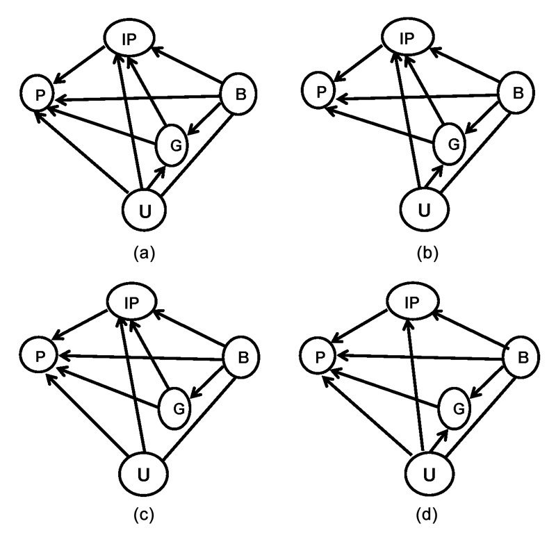 Fig. 1 Four examples of complex genotype-phenotype pathways: (a) the Phenotype (P) is contingent upon Genetic (G) factors, Intermediate Phenotype (IP) factors, Background (B) factors, and Unknown (U) factors. In addition, G and IP factors are contingent upon B and U, and, G is contingent upon U and B. (b) The same model as in (a), except P is not contingent upon U. (c) The same model as in (a), except G is not contingent upon U. (d) The same as in (a), except (IP) is not contingent upon (G).