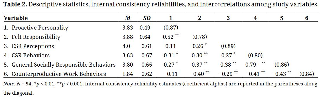 Hypothesis 1: Proactive personality will be positively related to felt responsibility for constructive change. Felt Responsibility for Constructive Change and Responsible BehaviorsLikewise, we hypothesize that felt responsibility for constructive change will predict responsible behaviors. Fuller and colleagues [14] significantly expanded the construct space for felt responsibility for constructive change by outlining the “other-oriented” nature of employees measuring high on this construct (p. 27). They strengthened Morrison and Phelps’ [15] arguments that, in addition to behaviors directly advantageous for the organization, felt responsibility would lead to constructive workplace behaviors that target supra-organizational interests, such as those of external stakeholders. Despite these theoretical assertions, both Morrison and Phelps [15] and Fuller et al. [14] principally focused on how felt responsibility influences employees’ desire to improve organizational efficiency and effectiveness. We contend this is an incomplete representation of a wider readiness for creating positive change that is both similar to and distinct from proactive tendencies alone [11,22]. To test this proposition, we consider three forms of socially responsible behaviors not previously studied in this context: Employee CSR behaviors, general socially responsible behaviors, and refraining from counterproductive work behaviors. We make a distinction between these variables in order to capture individual behaviors that would be associated with CSR as it is more traditionally defined, as well as behaviors beyond the bounds of CSR initiatives—both at work and beyond. We also do this to capture responsibility as manifested in both approach (e.g., help conserve energy) and avoid (e.g., refraining from participating in unethical acts) behaviors.