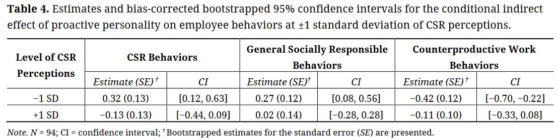 Table 4 presents the corresponding estimates and bias-corrected bootstrapped 95% confidence intervals for the conditional indirect effects of proactive personality, via felt responsibility for constructive change, on the three outcomes studied. As indicated by the non-overlapping confidence intervals in the index of moderated mediation for both CSRBs and CWBs, and the overlapping confidence intervals for GSRBs, CSR perceptions were found to moderate the effect of felt responsibility on CSRB and CWBs, but not GSRBs. This confirms Hypothesis 3, as well as our expectation that CSR perceptions would be more relevant for creating a strong situation (i.e., constrain the effect of individual differences) around workplace (as opposed to nonworkplace) behaviors.