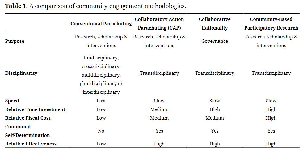 Still, like democracy itself, collaborative rationality may be flawed, but it also may be the best option availablexxxvi. Collaborative rationality offers a powerful model for community engagement and represents a successful means of expressing allyship and solidarity through governance. How could its lessons be applied outside of governance, however, and what would such a governance-oriented hybrid approach between conventional parachuting and CBPR look like for research, interventions and scholarship? Although hesitant to contribute yet another method to the morass of similarly named systems within the “new participatory research paradigm” [230], I have found that our newly developed method, collaboratory-action parachuting, combines the pragmatism of parachuting with the community-engagement and social-action facets of methods such as CBPR and its ilk. I recognize that we may not have been the first to practice what I am calling CAP—indeed, collaborative interventions have proven to be effective in addressing conflict around the world [250], and some of those may have utilized methodologies resembling CAP—but because this unconventional hybrid methodology has been absent from the academic literature until this point, if it has been practiced previously, then it has been without explicit documentation as a methodology. CAP, which will be discussed in more detail later in this paper, may fill a niche for those who do not have the resources needed to practice CBPR properly but who nonetheless want to engage a community in an action-oriented partnership, particularly toward energy independence and an energy democracy.