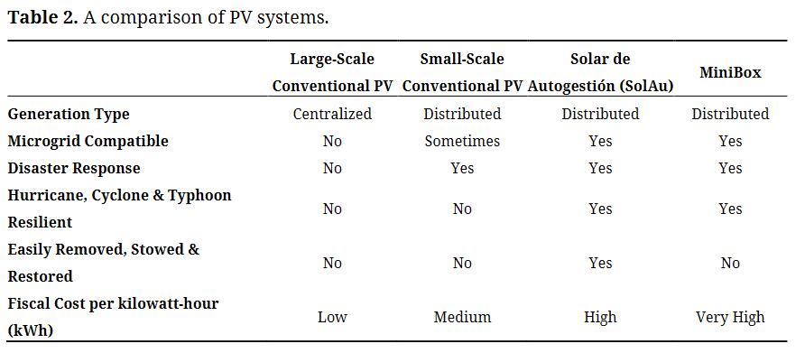 Although infrastructure cannot itself bring about an energy democracy, microgrids may be the closest to representing the physical manifestation of energy democracies. Basically, in an electric grid—a large-scale electric network that connects power plants, transmission lines, electric substations and consumer buildings—electricity is carried from the place of production to the place of consumption by way of power lines. Because everything within the grid is connected, failure in one part of the grid—such as downed power lines or inadequate production—can cause much or all of the grid to lose power. Microgrids operate similarly to conventional electric grids, except on a much smaller scale. Covering a single community or even a single buildingxxxvi, a microgrid with its own power production can disconnectxxxviii and run independently from the main grid when the latter fails, as it is prone to do during natural disasters. Much of the work to improve energy-system natural-disaster resilience (also called energy-system disaster preparedness) has focused on improvements in microgrid technologies. For example, in response to Hurricane Maria, Sandia National Laboratories identified 159 potential microgrid locations in Puerto Rico—including about a dozen nonresidential locations in Mayagüez—and evaluated the cost and benefit of each site [267]. To prevent the same devastating loss of power after Maria, however, microgrids alone are not enough: They need to be coupled with local power generation. Furthermore, because PV requires no input other than sunlight and is a cost-competitive technology, solar energy is an excellent energy-production candidate—and in some places the least-costly option [268]—to pair with microgrids to help make energy systems more resilient to natural disasters [269–274], particularly for an island like Puerto Rico [68,275]. Unlike typical electric generators, PV does not require inputs, such as fossil fuels, to be sent at a time when the ability to resupply those inputs may be cut off.