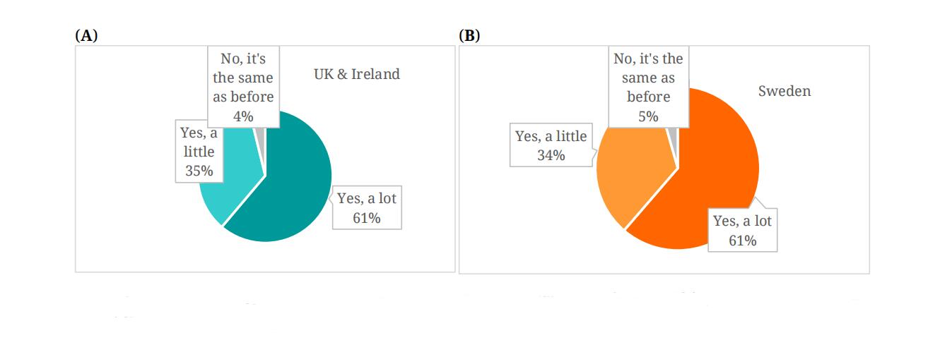Figure 1. Survey answers to the question “Has your attitude towards buying new things changed after you started KonMari”? (A) UK & Ireland; (B) Sweden.