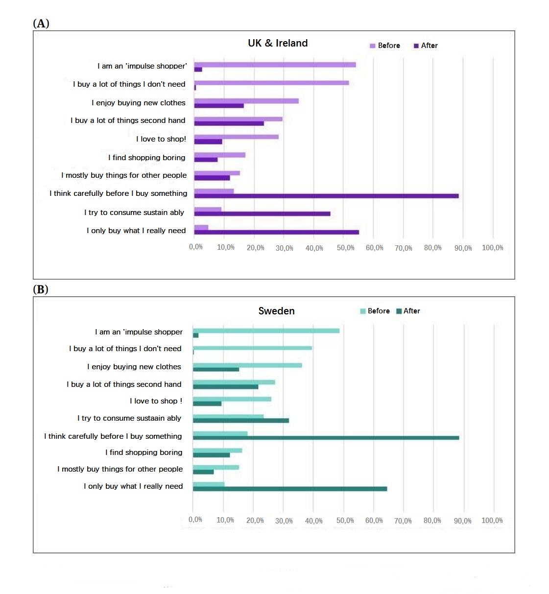 Figure 2. The KonMariers’ responses to survey questions comparing their consumption habits before and after they started with KonMari. The responses are sorted by answer frequency in the “before” category. (A) UK and Ireland; (B) Sweden.