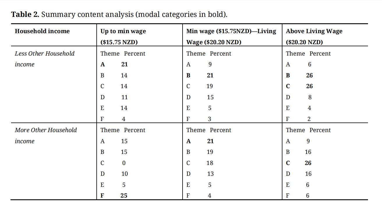 Next, we used the 3 × 2 classification cross-tabulation in Carr et al. [8] to create sub-analyses split by hourly wage: Up to and including $15.75, the legal Minimum Wage at the time; above Minimum Wage to the campaign Living Wage in New Zealand ($20.55 at the time); and greater than the campaign Living Wage ($20.55+). The content analysis was split further, again consistent with significant findings in Carr et al. [8], according to whether the amount of other household income, for example, over and above own hourly wage, was above or below the sample median (N = 1011). Whilst Carr et al. [8] found that number of dependents was not a significant predictor of job attitudes, it still might affect quality of life outside of work and so was included in this study, in this case through the theme G (in Table 1). The cross-tabulation with separate sub-content analyses resulted in the breakdown in Table 2. Themes G and H (dependents and flexible work) comprised just 1–4% of responses and therefore were not included (see outliers below).