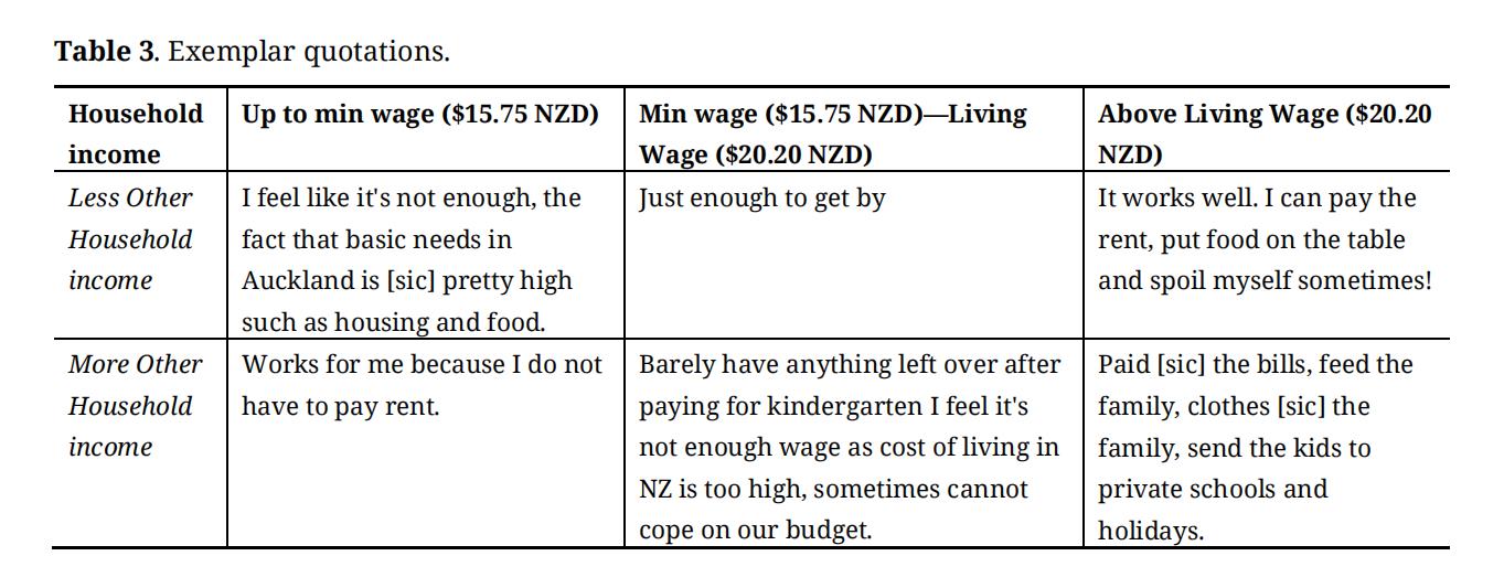 In Table 2, for those with “less other household income”, as wage rose so too did the modal category move from being “sub-threshold” to “minimally sufficient” to “living a good life” (from Table 1). With “more other household income” at the lowest hourly rate, the modal category was being “buffered by others”, shifting beyond the Minimum Waged participants to being “sub-threshold” and to “a good life” once paid beyond the Living Wage. Thus, the qualitative themes in the text data broadly converged with the quantitative findings in Carr et al. [8] with the exception of Minimum Waged respondents with “more other household income”, who reported being “sub threshold”.