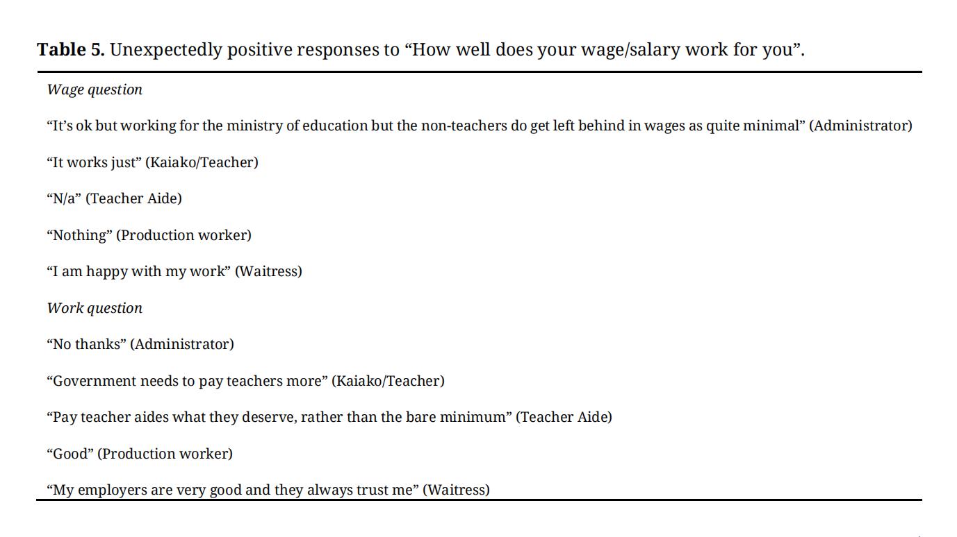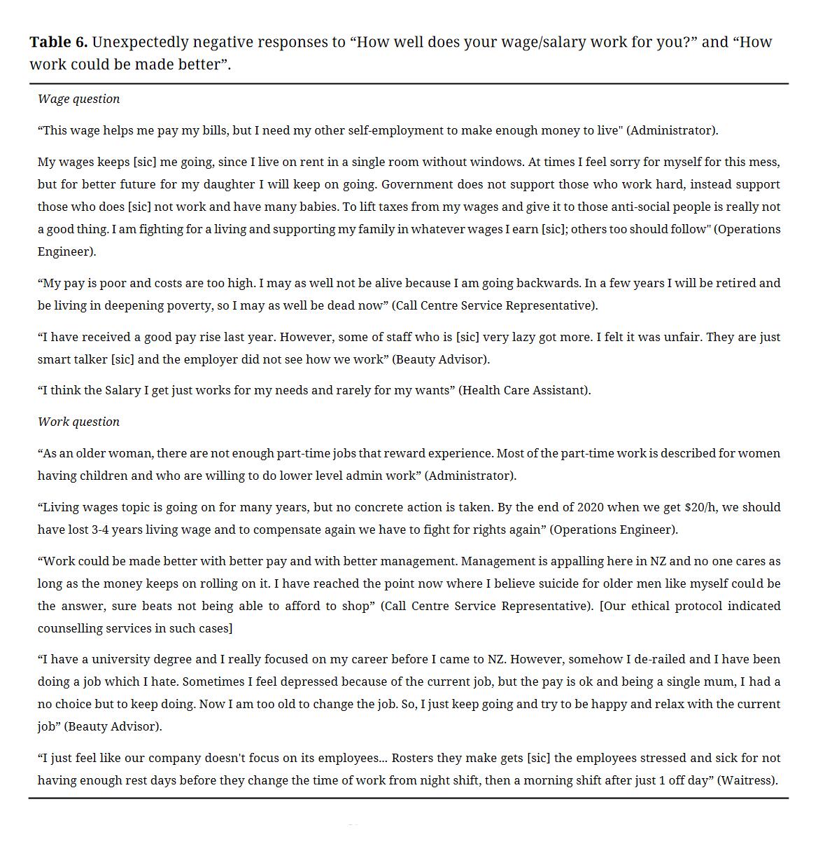 Table 6 contains responses from employees who were paid relatively well but reported being relatively unhappy. Even on the question about wage, the responses revealed a range of non-pecuniary concerns, from having to work a second job, supporting wider family, financial insecurity approaching old age, workplace injustice, and the distinction between needs versus wants. These non-pecuniary, precarity-related responses are underscored by the answers to our question about work/job. These stories included under-employment, frustration with employment relations, lack of human relations, depression and work overload.
