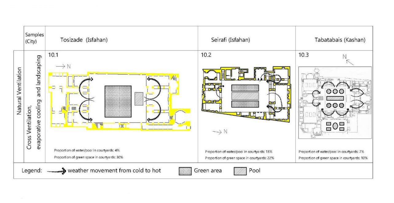 The findings suggest that traditional design strategies used in Iranian houses can create a sustainable microclimate in residential environments with minimum access to electricity and gas. The underlying principles uncovered by this research can be adopted in many modern and contemporary houses with similar climatic condition to decrease energy usage, and create a more thermally comfortable environment without the use of mechanical services that are costly both for people and for the planet. However, it is important to note that not all of the discussed strategies are applicable to every housing in different geographies, such as earth coupling due to high water table level or pools due to water scarcity. Therefore, a case by case approach is recommended.