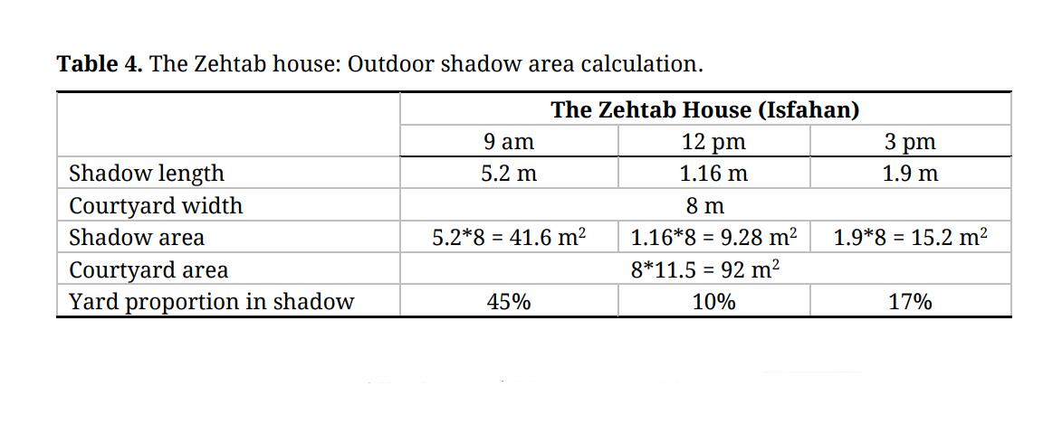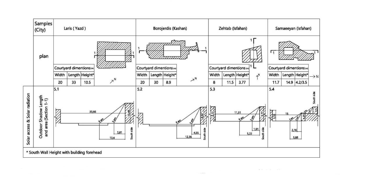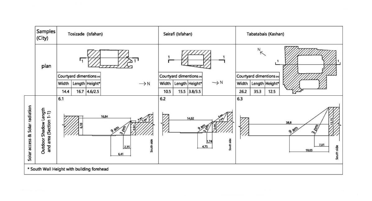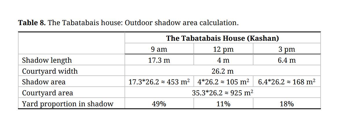 The findings indicate that taller walls on the south side of the courtyards provided expanded shaded areas and created thermally comfortable outdoor spaces for residents. For example, out of all seven studied houses, Tabatabais house had the tallest (13.75 m) north-facing wall in the courtyard, with the largest proportion of yard in shadow (49% at 9 am and 18% at 3 pm). Conversely, Seirafis house had the shortest (3.44 m) north-facing wall in the courtyard, providing the smallest proportion of yard in shadow (34% at 9 am, and 13% at 3 pm) among all the other houses. Therefore, this study suggests designing tall walls on the south side of the courtyards in northern hemisphere is a passive cooling strategy that contributes to the thermal comfort of the residents. This strategy is one of the most practicable passive solutions that can be incorporated in contemporary housing design. It is suggested that this strategy needs to be considered in building codes and regulations considering the geography and context of the building site.