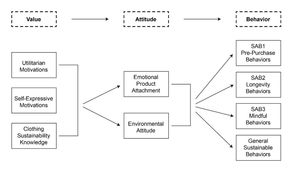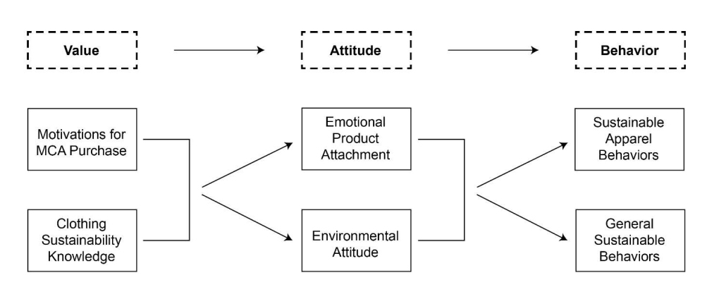 Conceptual FrameworkFollowing the value-attitude-behavior hierarchy, a conceptual framework was developed for the current study (see Figure 1) to guide the development of the research questions associated with the proposed relationships among three major groups of variables: (1) values, represented by consumers’ motivations for MCA purchases and clothing sustainability knowledge; (2) attitudes, denoted by emotional product attachment and environmental attitude; and (3) behaviors, characterized by sustainable apparel behaviors and general sustainable behaviors.