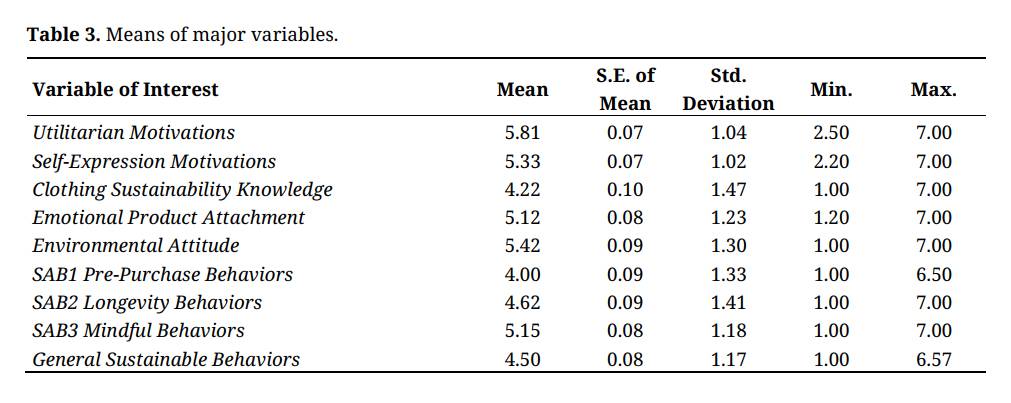 The self-reported survey took approximately 10 minutes to complete and consisted of sections related to respondents’ previous MCA purchases as well as the six variables of interest. All major variables were modified and developed based on previous literature and assessed using multi-item scales drawn from or created based on the literature review and measured with 7-point Likert type scales using 1 = strongly disagree, 7 = strongly agree for value and attitude measures, and 1 = never, 7 = always for behavioral measures. Items for motivations for MCA purchases were adapted from Merle et al. [38]; items for clothing sustainability knowledge were modified from Preuit [21]; emotional product attachment items were adapted from Mugge et al. [54] and Park & Yoo [3]; environmental attitude items were from Trivedi et al. [57]; items for sustainable apparel behaviors were from or adapted from Cho et al. [12] and Razzaq et al. [60]; and general sustainable behaviors were measured with items modified from Cho et al. [12], Razzaq et al. [60], and Trivedi et al. [57] or created based on a review of the literature. Demographic information (i.e., age, education, gender, and income) was also collected.