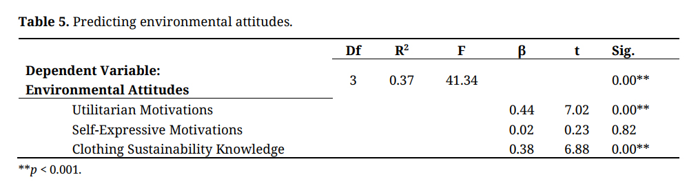 Addressing RQ#2, the second regression model included environmental attitudes as the dependent variable with the values (i.e., self-expressive motivations, utilitarian motivations, and Clothing Sustainability knowledge) entered as the independent variables. The overall model was significant (R2 = 0.37, F= 41.34, p < .001). Results indicated utilitarian motivations and clothing sustainability knowledge significantly predicted environmental attitudes (β = 0.44, t = 7.02, p < 0.001; β = 0.38, t = 6.88, p < 0.001, respectively). Self-expressive motivations did not predict environmental attitudes (β = 0.02, t = 0.23, p > 0.05). See Table 5.