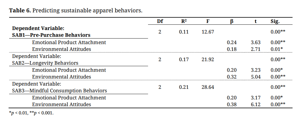 To answer RQ #3, three sets of multiple regression analyses were conducted with each of the three sustainable apparel behaviors (i.e., SAB1 pre-purchase behaviors, SAB2 longevity behaviors, SAB3 mindful consumption behaviors) entered as dependent variables and emotional product attachment and environmental attitudes entered as independent variables. All three of the models were significant (R2 = 0.11, F = 12.67, p < 0.001; R2 = 0.17, F = 21.92, p < 0.001; R2 = 0.21, F = 28.68, p < 0.001, respectively). Further, results indicated both emotional product attachment and environmental attitudes positively predicted SAB1 pre-purchase behaviors (β = 0.24, t = 3.63, p < 0.001; β = 0.18, t = 2.71, p < 0.01, respectively), SAB2 longevity behaviors (β = 0.20, t = 3.23, p < 0.01; β = 0.32, t = 5.04, p < 0.001, respectively), and SAB3 mindful consumption behaviors (β = 0.20, t = 3.17, p < 0.01; β = 0.38, t = 6.12, p < 0.001, respectively). See Table 6.