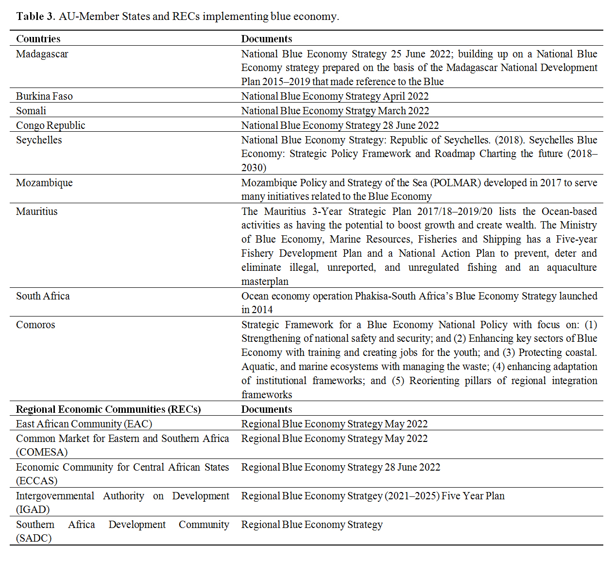 Table 3. AU-Member States and RECs implementing blue economy.