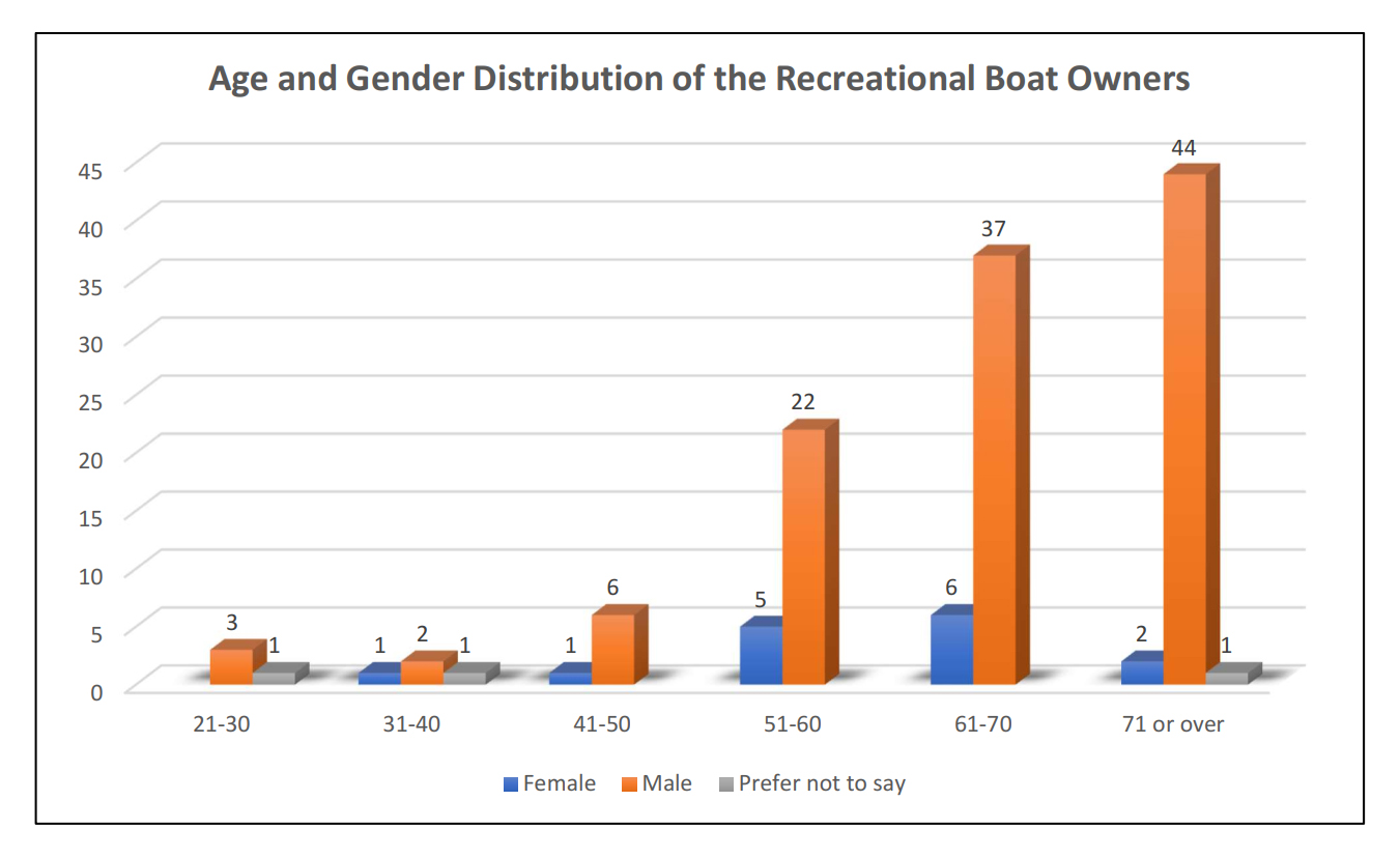 The gender distribution is the same as Sennitt’s [28] discovery in his research. However, the results of the respondents contradict what Ibabe et al. [22] and Lau [33] discovered in their perception studies on pollution and waste management at recreational ports. The majority of respondents in both studies are under 30 years old, and according to the survey by Ibabe et al. [22], the majority were female. In addition, the questionnaire in the prior two studies was delivered individually. In contrast, the questionnaire used in this study was web-based, which could cause the discrepancy. However, McAuliffe et al. [34] and Sennitt [28] used web-based surveys and still obtained different age distributions from those found in this research.