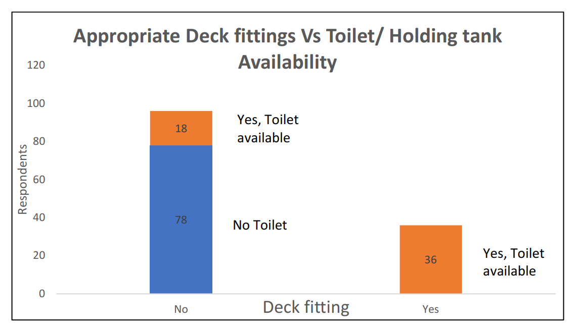 According to Sennitt [28] and Byrnes et al. [29], the knowledge of the types of vessels in the harbour is essential to know their impacts on the environment 75% of the respondents have Sailboats powered by wind (with 64% being Yacht and dinghy being 11%), followed by Motorboat with cabin (16%) and without cabin (1%), kayak/canoe (4%), paddleboard (2%), and RIB inflatable represents 2%. However, most respondents own their vessels (87%), and 72% have only one vessel. Most responders (73%) do not have the necessary deck fittings on board their vessel to discharge sewage at an onshore pump-out station. Toilets/holding tanks are on board 19% of boats without deck fittings. However, 100% of respondents with deck fittings have toilets (Figure 4). To obtain a comprehensive picture of the type of waste generated, boat owners were asked what type of waste they discharged. Sewage is the most generated waste (42%), followed by petroleum/fuel waste (19%), hazardous items (13%), and solid wastes (11%) (Figure 5). However, 15% of respondents reported that their vessels generate no waste, and 23% maintained that they discharged their wastes at sea according to the discharge law. In comparison, 14% of respondents discharge their wastes directly into Chichester Harbour.